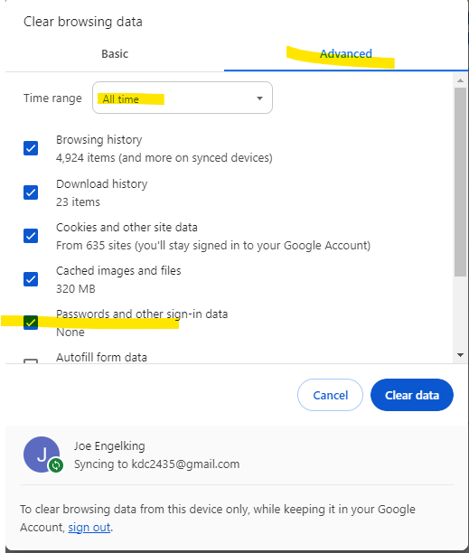 To do this go to chrome://settings/privacy then CLEAR BROWSING DATA and select ADVANCED – Time Range ALL TIME – and then select PASSWORDS AND SIGN IN DATA and select Clear DATA
