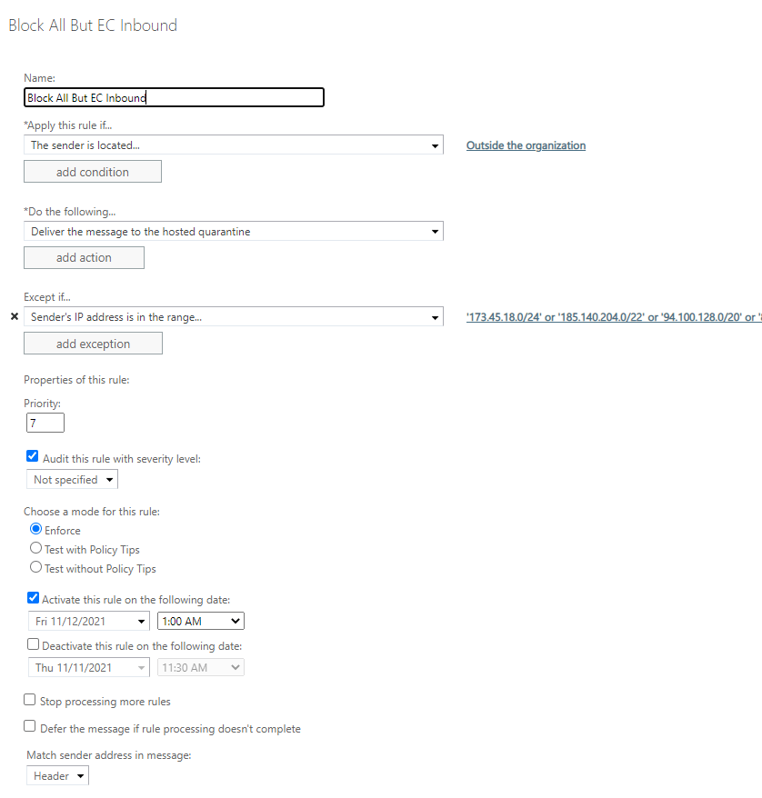 - Set Settings to APPLY THIS RULE if the sender is located outside the organization